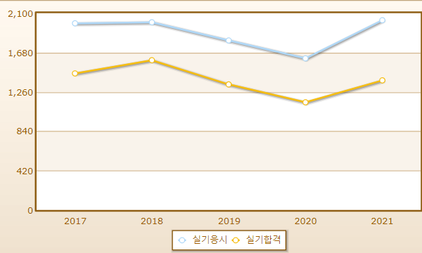 연도별 실기시험 합격률이며 2021년 기준 응시자 수는 2,025명으로 그 중 합격자는 1,383명입니다.