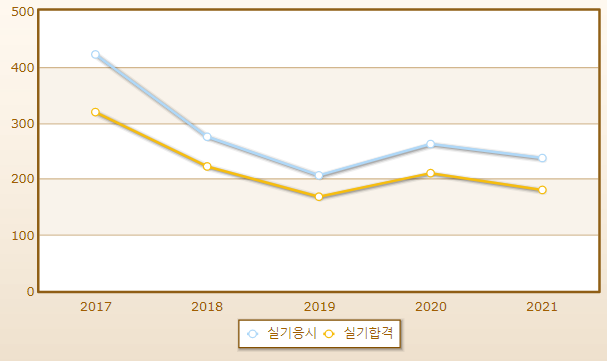 연도별 실기시험 합격률이며 2021년 기준 응시자 수는 237명으로 그 중 합격자는 180명입니다.