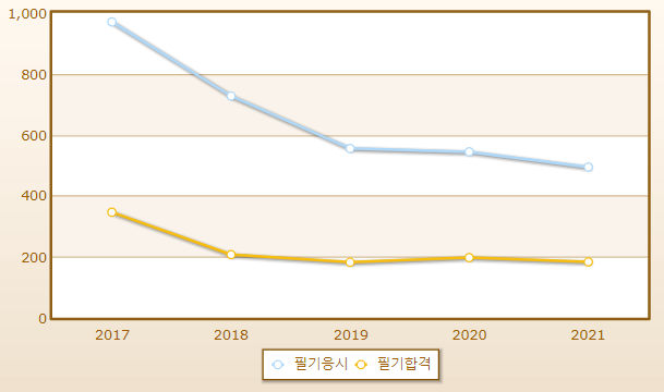 연도별 필기시험 합격률이며 2021년 기준 응시자 수는 494명으로 그 중 합격자는 183명입니다.