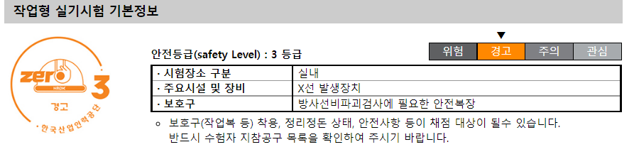 실기시험의 경우 안전등급 3등급의 시험으로 방사선비파괴검사에 필요한 안전복장을 착용해야 하며 수험생 지참공구 목록을 확인하여 챙기셔야 감점을 당하지 않으니 유의 하시길 바랍니다.