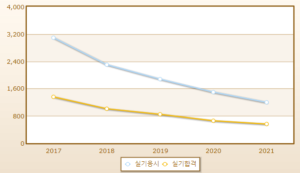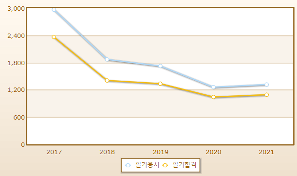 연도별 필기시험 합격률이며 2021년 기준 응시자 수는 1,317명으로 그 중 합격자는 1,093명입니다.