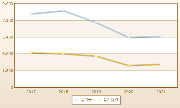 연도별 실기시험 합격률이며 2021년 기준 응시자 수는 5,464명으로 그 중 합격자는 2,475명입니다.