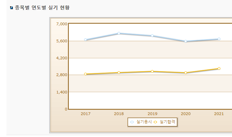 실기시험 연도별 합격률이며, 2021년 기준 실기 응시자는 5,749명으로 그 중 합격자는 3,320명입니다.
