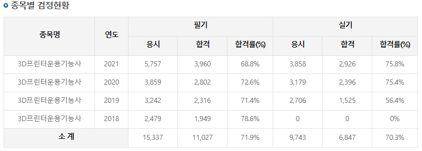 위 이미지는 3D프린터운용기능사의 종목별 검정현황입니다. 신생자격증인 만큼 2018~2021년도 현황만 있으며, 필기시험과 실기시험모두 높은 합격률을 보여주고 있습니다.