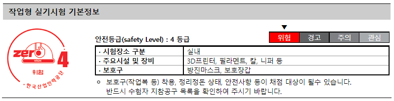 또한 실기시험 시 신분증, PC(필요시 지참), 니퍼, 롱 우즈 플라이어, 방진마스크, 보호장갑, 칼 혹은 가위, 테이프/시트, 헤라와 마스크를 지참하셔야 합니다. 특히 마스크와 보호장갑은 실기시험을 치르는 곳이 안전등급 4등급의 시험장일 수도 있으므로 안전을 위해서 지참하셔야 합니다. 안전도구를 지참하지 않으시면 감점의 요인이 될 수 있습니다.