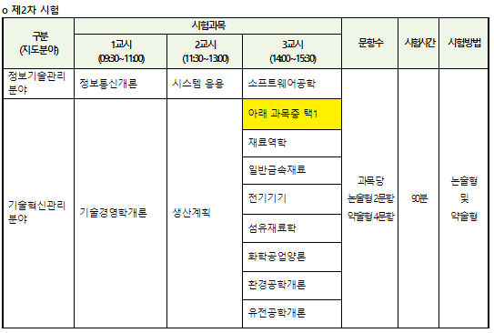 기술지도사 2차 시험은 '정보기술관리 분야'와 '기술혁신관리 분야'로 구분됩니다. 각 지도 분야별로 수험 과목이 다르므로 위의 이미지를 참고하시기 바랍니다. 분야 관계없이 과목당 논술형 2문항, 약술형 4문항으로 출제되며 시험시간은 90분이 소요됩니다. 기술혁신관리 분야를 선택하시면 3교시는 선택과목이므로 자신에게 적합한 과목을 선택하시기 바랍니다.