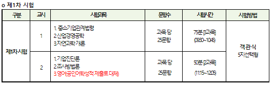 기술지도사의 1차 시험은 1,2교시로 나누어져 있습니다. 1교시는 '중소기업관계법령', '산업경영공학', '자연과학 개론'으로 총 3과목이며 과목당 25문항으로 총 75문항입니다. 시험시간은 75분이며 문제는 객관식으로 5지 선택형으로 출제됩니다. 2교시는 '기업진단론', '조사방법론'으로 2과목이며 영어과목은 공인 어학성적 제출로 대체 가능합니다 과목당 25문항으로 총 50문항이며 시험시간은 50분으로 문제는 객관식 5지 선택형으로 출제됩니다.