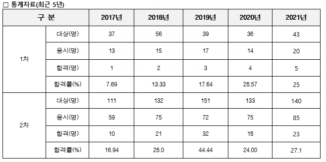 위 이미지는 기술지도사의 최근 5년간 합격 통계자료입니다. 매년 응시생 수는 50명 전후로 매우 적습니다. 합격률 또한 2020년에 28%으로 가장 높은 합격률도 굉장히 낮습니다. 2차 시험도 2019년의 44%가 가장 높은 합격률로 매우 낮은 합격률을 보이고 있습니다.