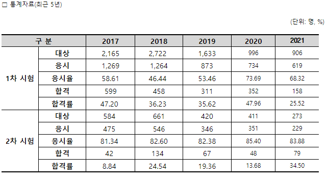 위 이미지는 수산물품질관리사의 최근 5년간 통계자료입니다. 1차시험의 경우 2021년에 합격률이 25%로 굉장히 낮습니다. 2차시험은 2017년의 경우 8%이며 21년에는 34%까지 올라왔지만 여전히 낮은 합격률을 보이고 있습니다. 어려운 시험인 만큼 취득하시면 전문능력을 인정받을 수 있습니다.