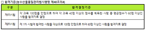 수산물품질관리사의 합격기준은 1차 시험의 경우 각 과목 100점을 만점으로 하여 각 과목 40점 이상의 점수를 획득한 사람 중 평균 점수가 60점 이상이여야하며 2차 시험의 경우 1차시험을 합격한 사람을 대상으로 100점 만점으로 하여 60점이상 득점하여야 합격 가능합니다.