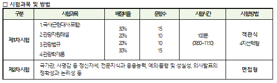 국내여행안내사는 1차, 2차 시험으로 나누어져 있습니다. 제1차 시험의 경우 국사, 관광자원해설, 관광법규, 관광학개론으로 총 4과목으로 이루어져 있고 각각 30%,20%,20%,30%으로 배점 비율이 정해져 있습니다. 국사 과목은 15문항, 관광자원해설 과목은 10문항, 관광법규 과목은 10문항, 관광학개론 과목은 15문항으로 총 50문항이 출제됩니다. 시험시간은 100분이며 시험은 객관식으로 4지 선택형으로 출제됩니다. 제2차 시험의 경우 국가관 와 사명감 등 정신자세, 전문지식과 응용능력, 예의 품행 및 성실성, 의사 발표의 정확성과 논리성 등을 평가하며 면접형식으로 진행됩니다.