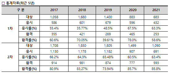 위 내용은 최근 5년간 국내여행안내사 합격 통계자료입니다. 2020년에 1차 시험 합격률은 78%으로 높은 합격률을 보였지만 2021년 에는 58.6%으로 떨어진 것을 확인할 수 있습니다. 높은 합격률이라고 볼 수는 없으며 철저히 준비하여야 합니다. 2차 시험의 경우 대체로 80% 이상의 합격률을 보이며 1차 시험만 합격하시면 무난히 합격이 가능한 것으로 예상됩니다.