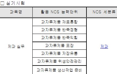 제과기능사 시험은 국가직무능력표준(NCS)를 기반으로 시험을 보게되며 시험과목은 아래와 같습니다.
