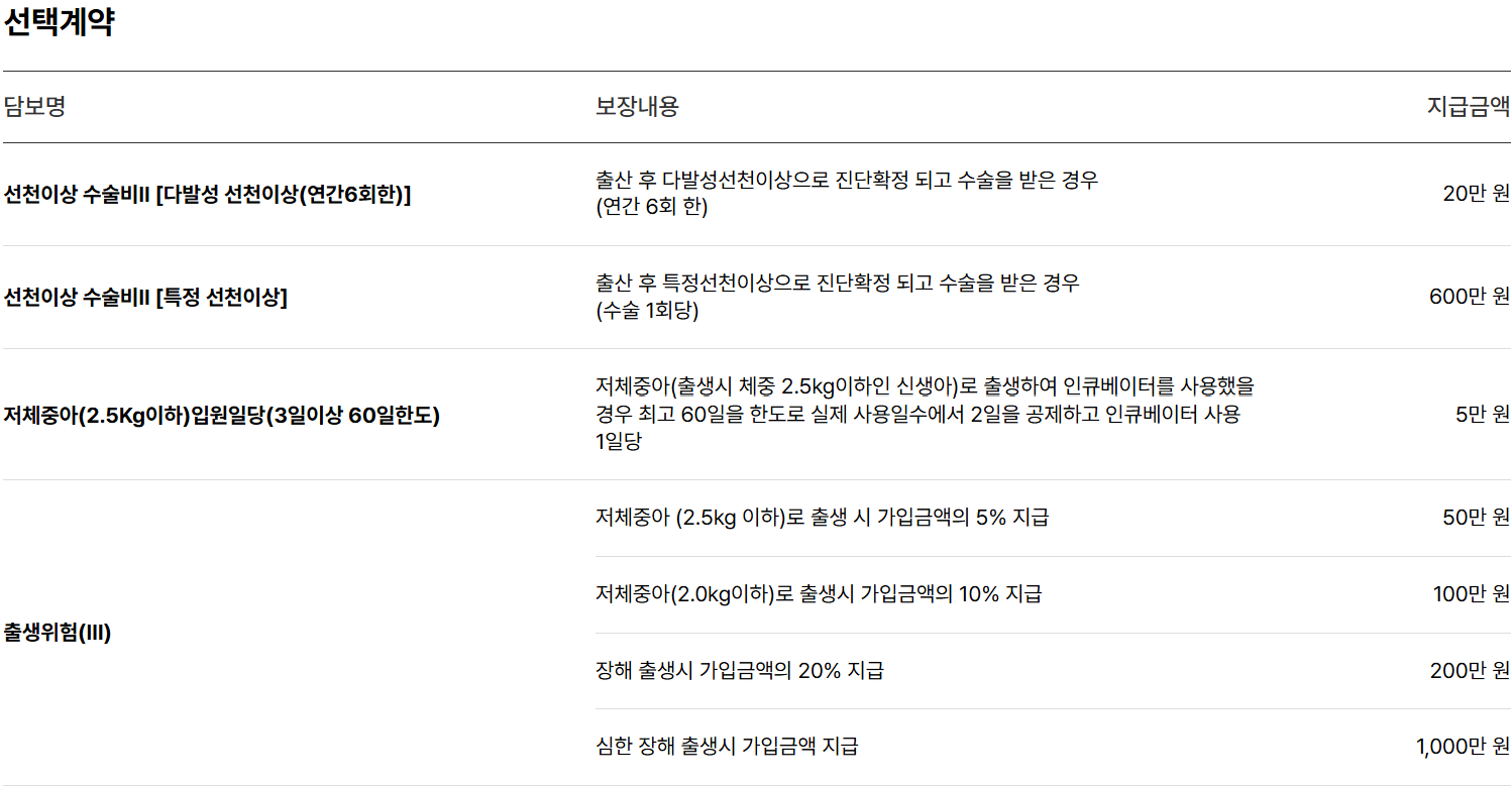 특약 구성 | 조산, 인큐베이터, 선천이상 등 | 암, 뇌, 심장, 희귀질환 등 |