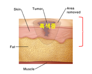 흑색종은 광범위 절제술을 시행하는데 보이는 것 뿐만 아니라 정상으로 보이는 부분까지도 포함해서