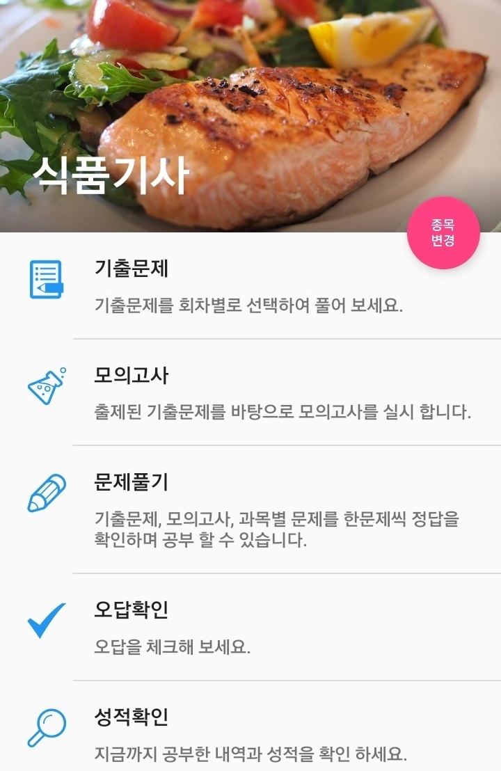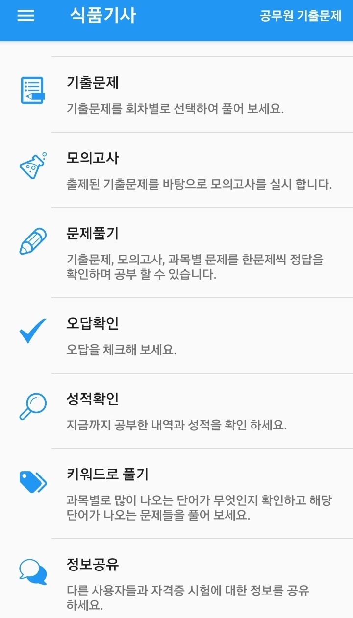 어플을 이용하여 연도별 기출문제와 모의고사 여러 유형의 문제들을 풀 수 있고, 오답 확인까지 가능합니다.