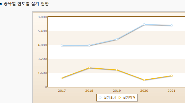 식품기사 실기 연도별 합격률표입니다. 2021년 기준 응시자 수는 7,032명으로 그중 합격자는 1,264명입니다.