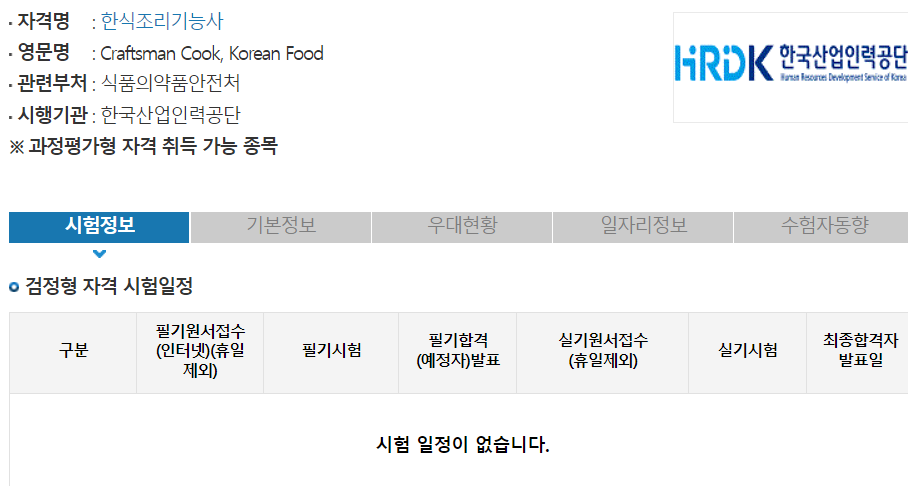 한식조리기능사 시험일정 및 시험과목