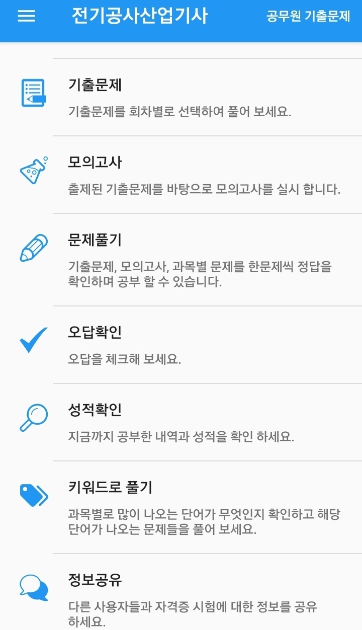 자격증 및 공무원 시험 공부를 할수 있는 기출문제앱 입니다!! 100종목 이상의 자격증 기출문제와 2007년부터 2018년 상반기까지의 공무원 시험 기출문제를 풀어 볼 수 있습니다. 1. 기출문제 기