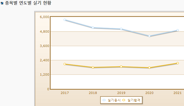 필기시험의 합격률은 높은편이며 실기시험의 합격률은 50%가 되지 않는 난이도가 좀 있는 시험입니다.