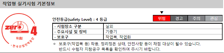 실기시험의 경우 안전등급 4등급의 시험으로 꼭 보호구 착용 및 수험생 지참공구 목록을 참고하셔서 챙겨 가셔야 합니다.