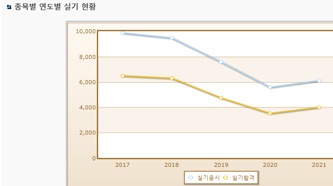 실기 시험의 경우 60%를 넘어가지만 필기시험의 경우 합격률이 엄청 낮은 시험으로 시험대비를 철저히 해야 합니다.