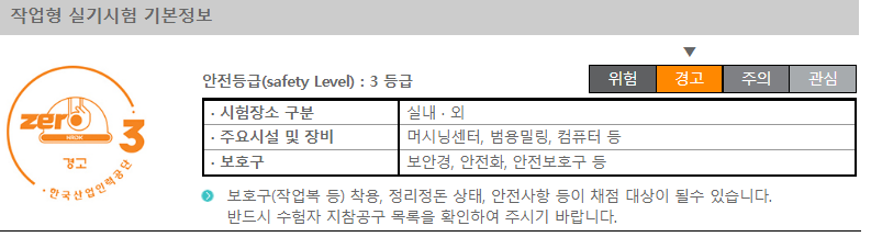 밀링기능사 시험은 안전 레벨 3등급으로 보호구와 수험자 지참 공구를 꼭 챙겨가셔야 합니다.