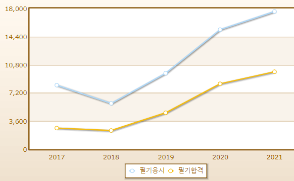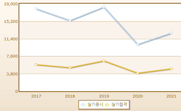 중식조리기능사 연도별 필기시험 합격률이며 2021년 기준 응시자 수는 17,631명으로 그 중 합격자는 9,907명입니다.