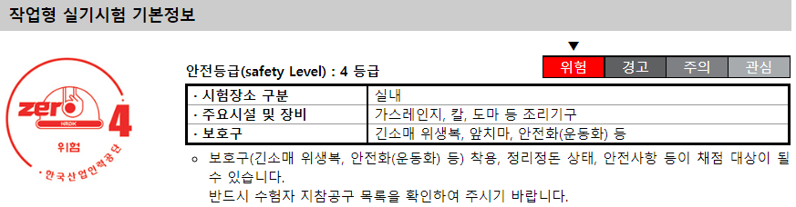 중식조리기능사는 실기는 불과 칼을 다루는 시험으로 안전등급 4등급의 시험으로 꼭 보호구 및 수험생 지참공구 목록을 확인하여 챙겨가셔야 감점을 받지 않으니 꼭 챙기시길 바랍니다.