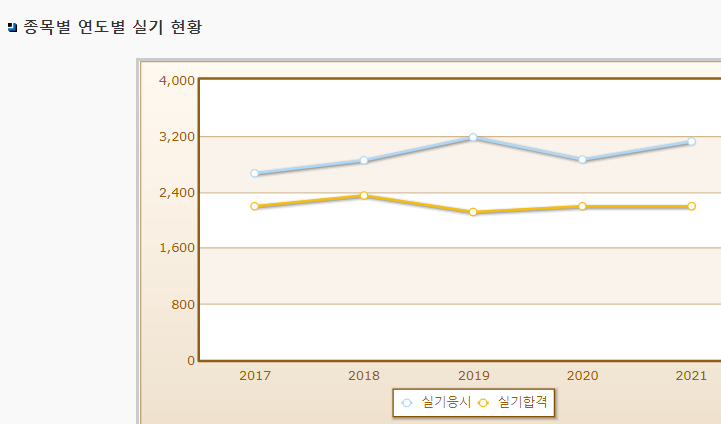 연도별 필기시험 합격률이며 2021년 기준 필기시험 응시자 수는 3,455명으로 그 중 합격자는 1,788명입니다.