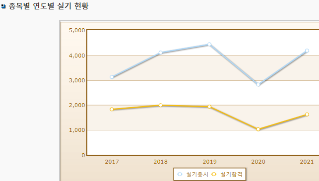 실기시험 연도별 합격률이며 2021년 기준 실기시험 응시자 수는 4,182명으로 그 중 합격자는 1,624명입니다.